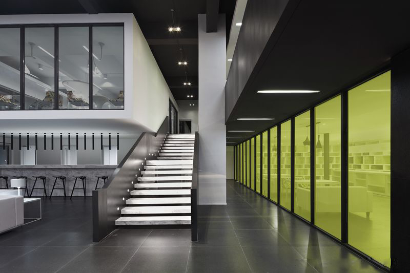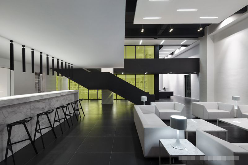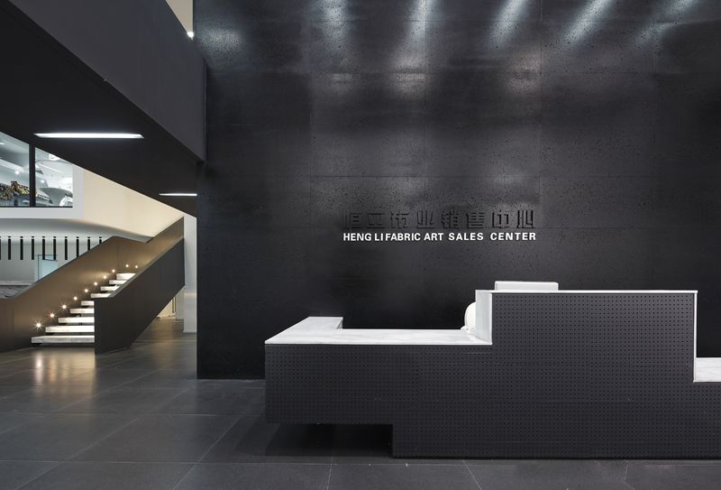 在入口處,放置了一座極富幾何造型的平臺作為公司形象前臺,設計師還利用黑色洞石墻隔出了一個(gè)前廳,前廳后面的空間被隔成上下兩層,作為兩個(gè)不同系列產(chǎn)品的展示廳,這是為了更好的展示公司品牌產(chǎn)品。