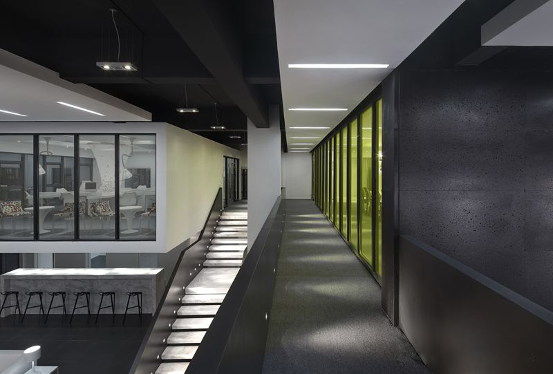 設計師利用大面積的精致門(mén)窗給辦公區留出了自然采光最好的位置,整個(gè)空間的色彩以冷灰調為主,嫩綠色的有色玻璃隔斷豐富了空間色彩,給空間添了一股活力。